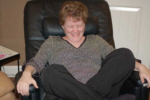 In non-bodily news, I had a lovely birthday filled with wonderful gifts. Thank you to everyone for your well-wishes. And as a special treat I got to visit with Lisa O who is visiting her friend Heather. Lisa enjoys reading our blog from her home in California. She gave us this wonderful present of these two "family-friendly" onesies and another shirt. Aren't these fabulous! I just love how the blog creates connections with people all of the world.